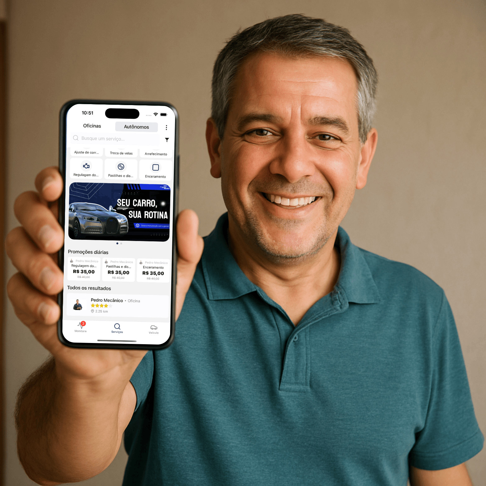 Tenha acesso a serviços automotivos como mecânica, reparos, emergências, estética, manutenções, borracharia e muito mais, onde o você estiver. Agende pelo celular, escolha os serviços que deseja fazer e decida se quer ser atendido em casa, no espaço da oficina ou em qualquer lugar!