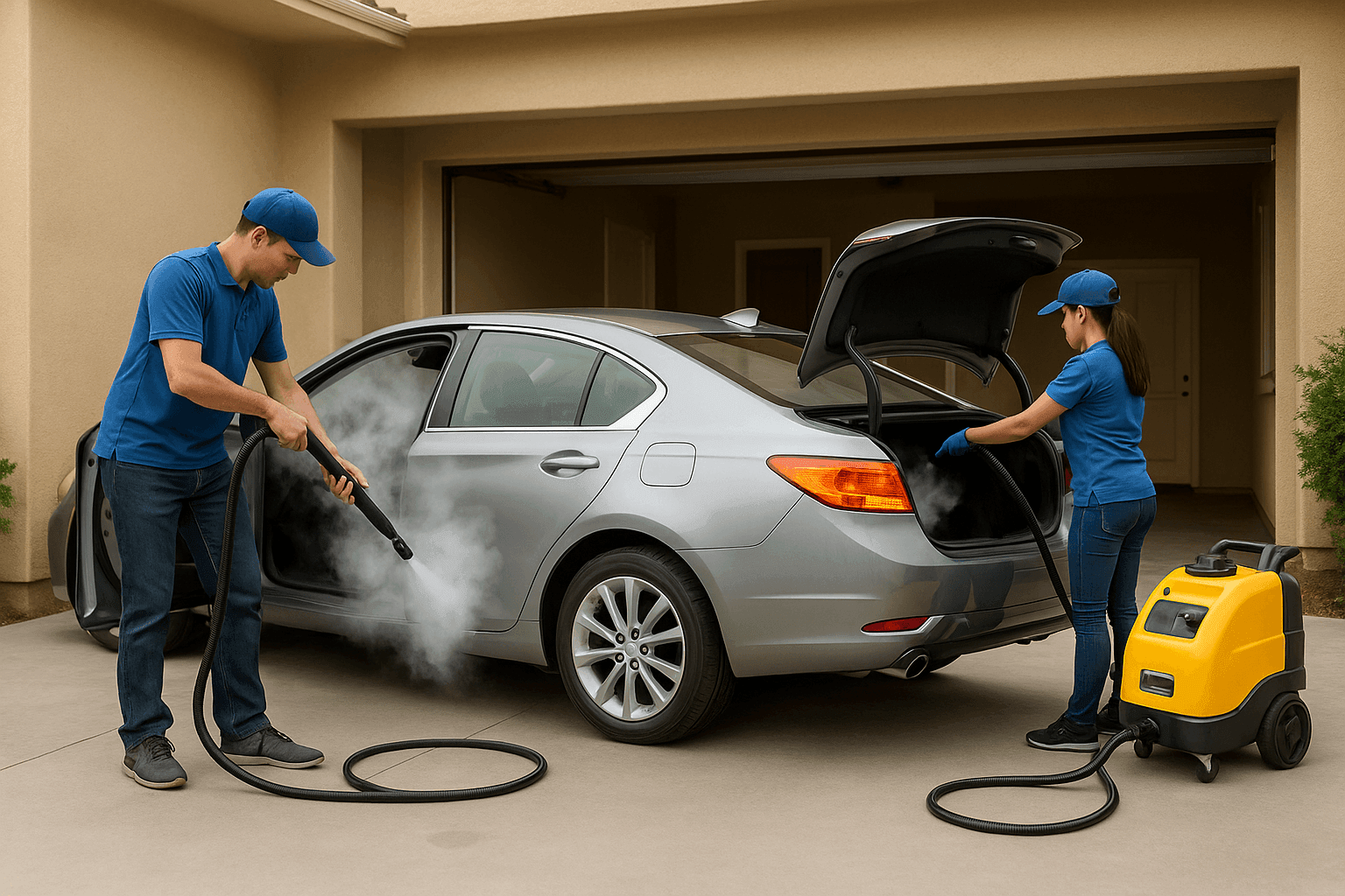 Cliente relaxa em casa enquanto um profissional lava seu carro com cuidado e qualidade.